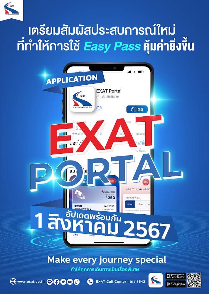 ทั้งนี้ ผู้ใช้บริการสามารถอัปเดต และดาวน์โหลด Application EXAT Portal เวอร์ชั่นใหม่ได้ที่ App Store และ Google Play Store สอบถามรายละเอียดเพิ่มเติมได้ที่  www.thaieasypass.com www.exat.co.th หรือ EXAT Call Center โทร 1543 ตลอด 24 ชั่วโมง