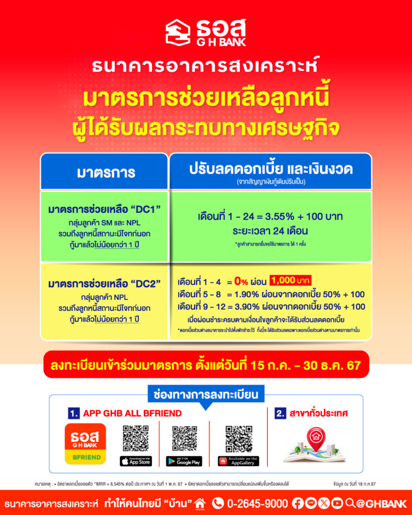 ธอส. จัดทำมาตรการช่วยเหลือลูกหนี้ผู้ได้รับผลกระทบทางเศรษฐกิจ (DC1 – DC2) ตั้งแต่บัดนี้ – 30 ธันวาคม 2567