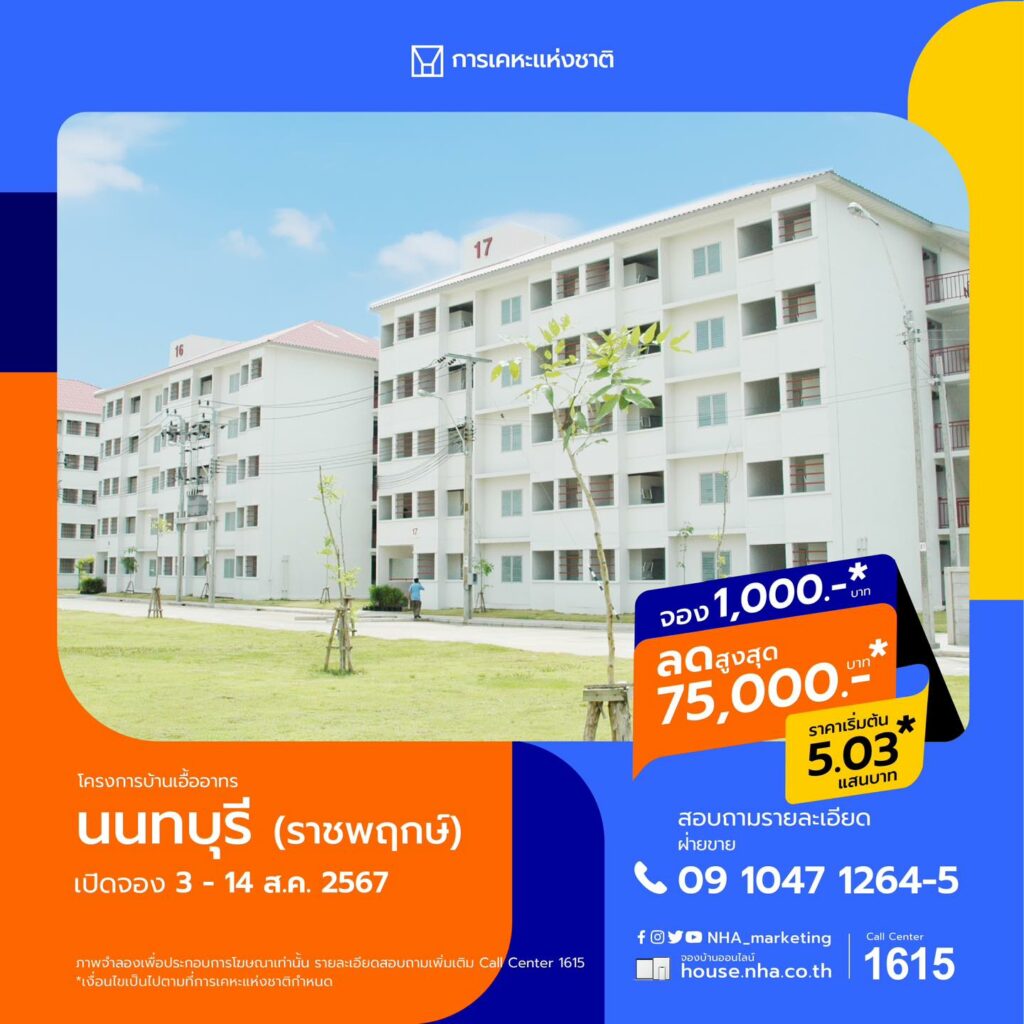 การเคหะแห่งชาติ สนับสนุนการมีบ้านของคนไทยเปิดจองโครงการบ้านเอื้ออาทรนนทบุรี (ราชพฤกษ์) อาคารชุด 5 ชั้น 1 ห้องนอน 1 ห้องน้ำ