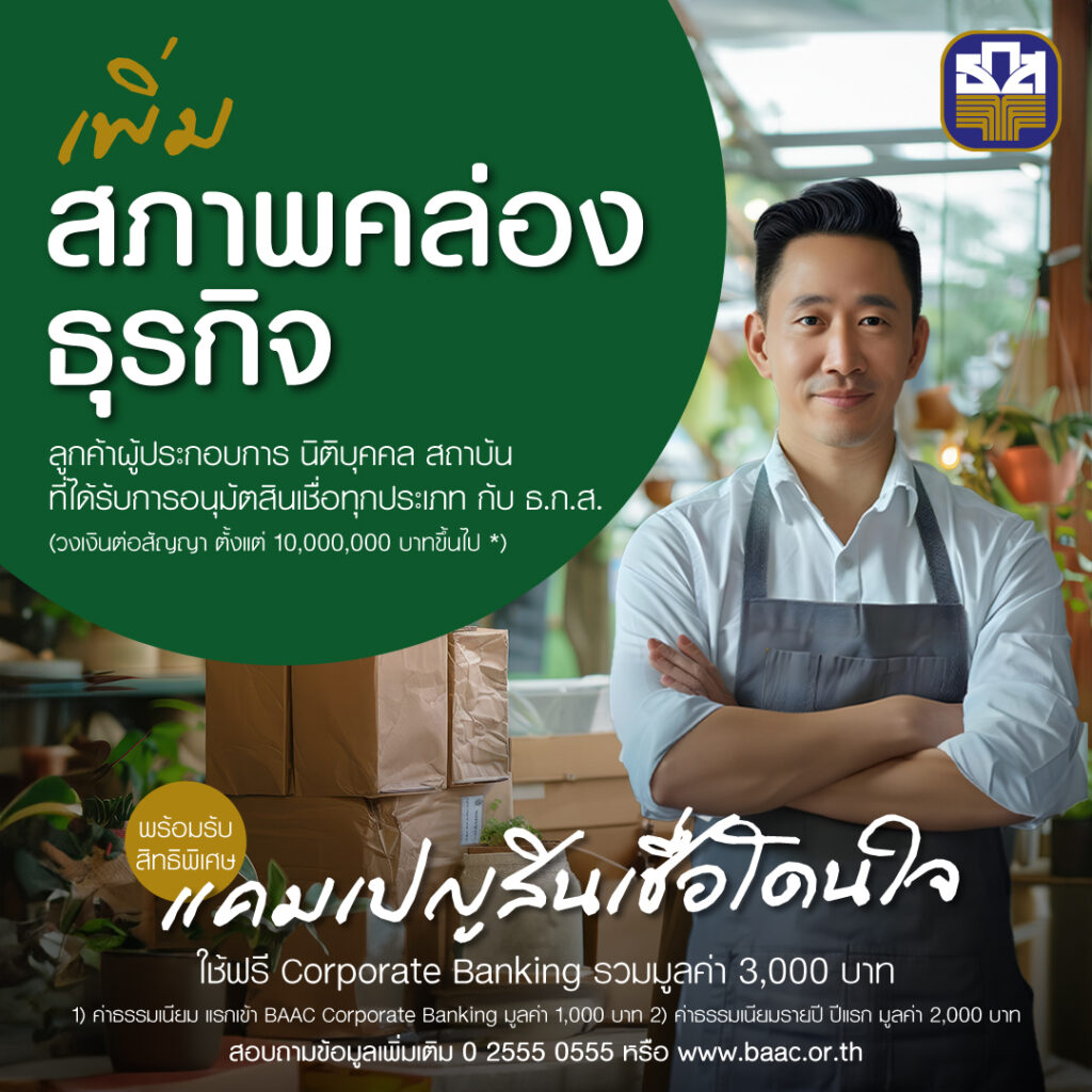 ธ.ก.ส. จัดแคมเปญสินเชื่อโดนใจ ใช้ฟรี Corporate Banking เสริมสภาพคล่องให้ธุรกิจก้าวหน้า