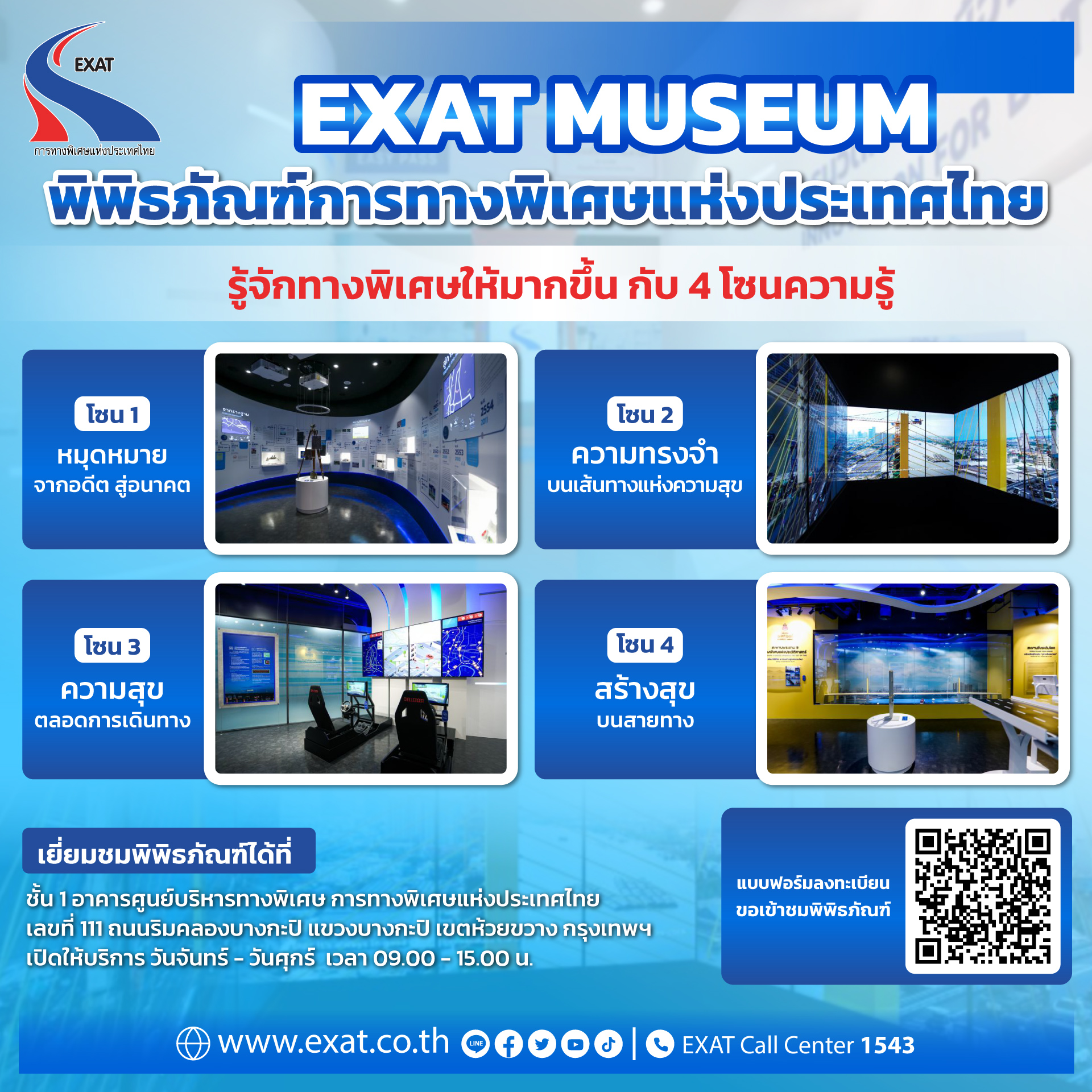 การทางพิเศษแห่งประเทศไทย แนะนำพิพิธภัณฑ์การทางพิเศษแห่งประเทศไทย หรือ EXAT MUSEUM เปิดให้บริการ วันจันทร์ – ศุกร์ เวลา 9.00-15.00 น. ณ บริเวณชั้น 1 อาคารศูนย์บริหารทางพิเศษ การทางพิเศษแห่งประเทศไทย