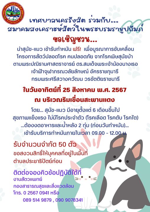 เทศบาลนครรังสิต ร่วมกับ สมาคมสงเคราะห์สัตว์ในพระบรมราชูปถัมภ์ ขอเชิญชวนนำสุนัข-แมว เข้ารับทําหมัน ฟรี! เพื่อบูรณาการขับเคลื่อน โครงการสัตว์ปลอดโรค คนปลอดภัย จากโรคพิษสุนัขบ้า ตามพระปณิธานศาสตราจารย์ ดร.สมเด็จพระเจ้าน้องนางเธอ เจ้าฟ้าจุฬาภรณวลัยลักษณ์ อัครราชกุมารี กรมพระศรีสวางควัฒน วรขัตติยราชนารี