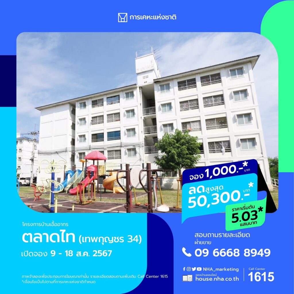 การเคหะแห่งชาติ สนับสนุนการมีบ้านของคนไทยเปิดจองโครงการบ้านเอื้ออาทรตลาดไท (เทพกุญชร 34) อาคารชุด 5 ชั้น 2 ห้องนอน 1 ห้องน้ำ