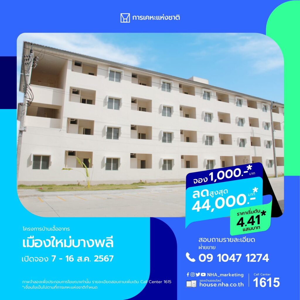 การเคหะแห่งชาติ สนับสนุนการมีบ้านของคนไทยเปิดจองโครงการบ้านเอื้ออาทรเมืองใหม่ บางพลี อาคารชุด 4 ชั้น 1 ห้องนอน 1 ห้องน้ำ