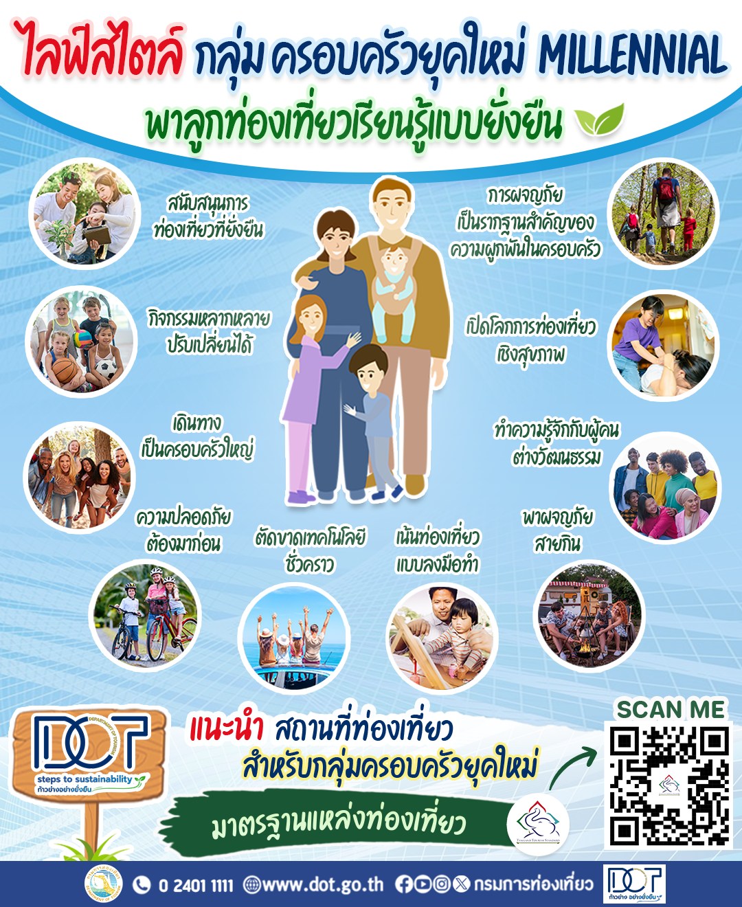 กรมการท่องเที่ยว แนะนำไลฟ์สไตล์ กลุ่มครอบครัว Millennial พาลูกเที่ยวเรียนรู้แบบยั่งยืน โดยมีแนวโน้มและความคาดหวังจากการพาลูกท่องเที่ยว จากปัจจัย 10 ประการ ดังนี้