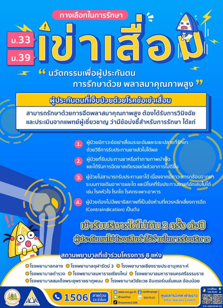 สำนักงานประกันสังคม ได้เพิ่มสิทธิประโยชน์การรักษาด้วยพลาสมาคุณภาพสูง (Plasma Rich Growth Factor (PRGF)) ซึ่งเป็นนวัตกรรมสมัยใหม่ที่เป็นทางเลือกในการรักษาแก่ผู้ประกันตนที่เจ็บป่วยด้วยโรคข้อเข่าเสื่อม