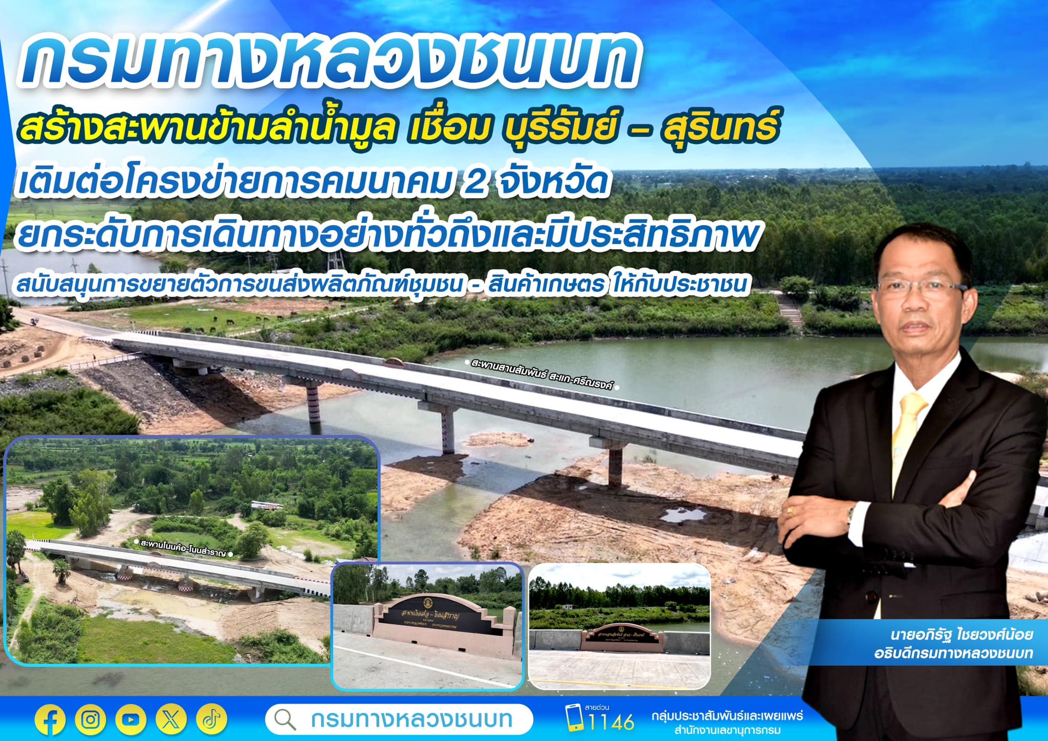 กรมทางหลวงชนบท สร้างสะพานข้ามลำน้ำมูล เชื่อม บุรีรัมย์ – สุรินทร์ เติมต่อโครงข่ายการคมนาคม 2 จังหวัด ยกระดับการเดินทางอย่างทั่วถึงและมีประสิทธิภาพ สนับสนุนการขยายตัวการขนส่งผลิตภัณฑ์ชุมชน – สินค้าเกษตรให้กับประชาชน
