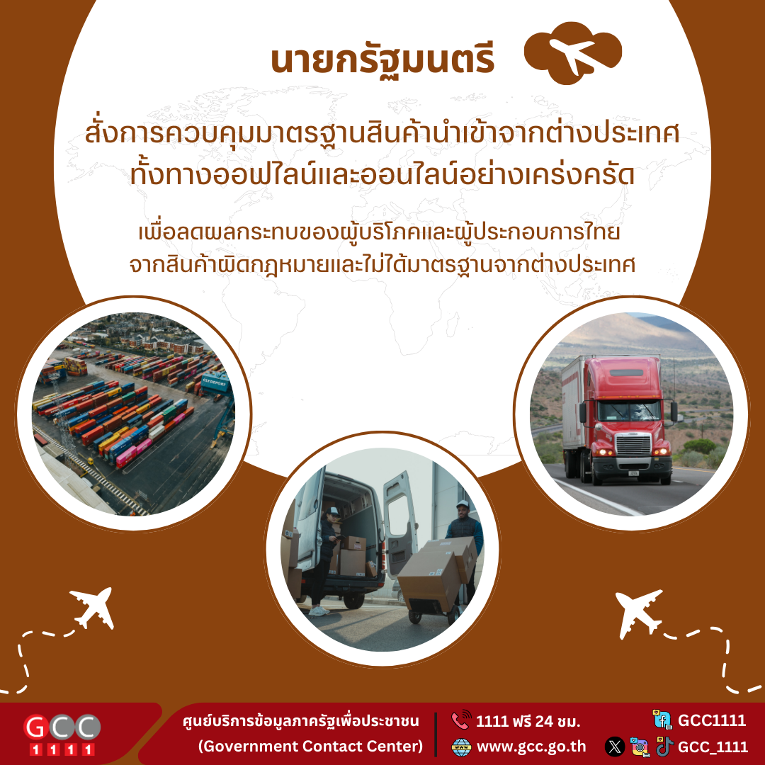 นายกฯ สั่งการควบคุมมาตรฐานสินค้านำเข้าจากต่างประเทศทั้งทางออฟไลน์และออนไลน์อย่างเคร่งครัด เพื่อลดผลกระทบของผู้บริโภคและผู้ประกอบการไทย จากสินค้าผิดกฎหมายและไม่ได้มาตรฐานจากต่างประเทศ