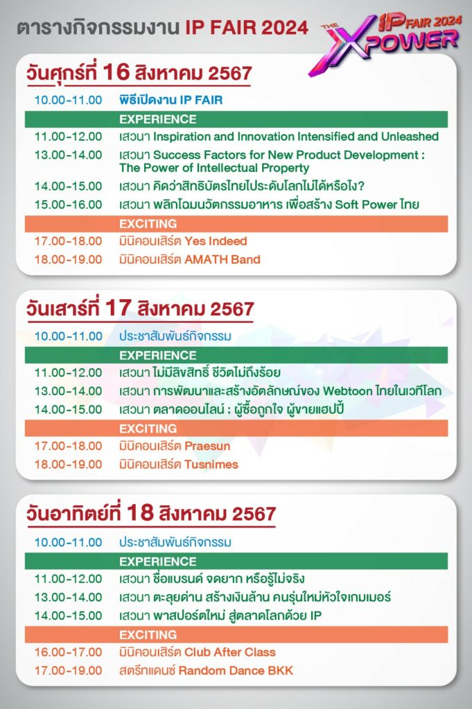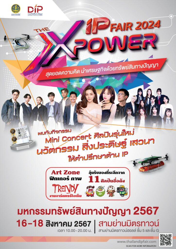 กรมทรัพย์สินทางปัญญา จัดงาน IP Fair 2024 วันที่ 16 – 18 สิงหาคม 2567 เวลา 10.00 – 20.00 น. ณ ชั้น 5 มิตรทาวน์ ฮอลล์ และชั้น G ศูนย์การค้าสามย่านมิตรทาวน์