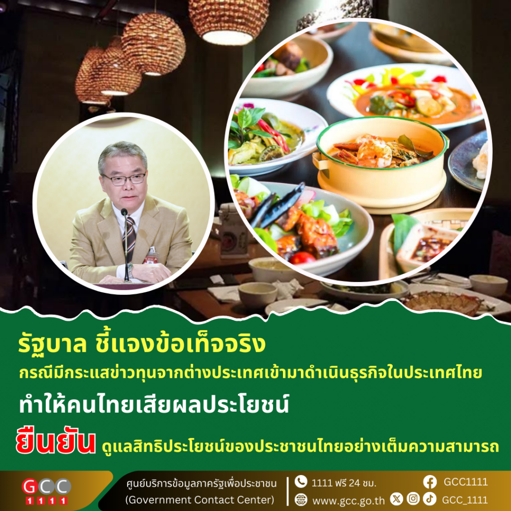 รัฐบาล ย้ำให้ทุกหน่วยงานดำเนินการตามกฎหมายอย่างเคร่งครัด ดูแลสิทธิประโยชน์ของประชาชนไทยอย่างเต็มความสามารถ พร้อมสั่งการชี้แจงข้อเท็จจริง ไม่ยอมให้ทุนต่างประเทศทำให้คนไทยเสียผลประโยชน์ ยืนยันร้านอาหารโดยผู้ประกอบการไทยยังจดทะเบียนใหม่ พาณิชย์เสริมเเกร่งต่อเนื่อง และย้ำไม่สามารถโอนใบอนุญาตประกอบการขนส่งระหว่างนิติบุคคล การขอใบอนุญาตต้องปฏิบัติตามกฎหมายไทย