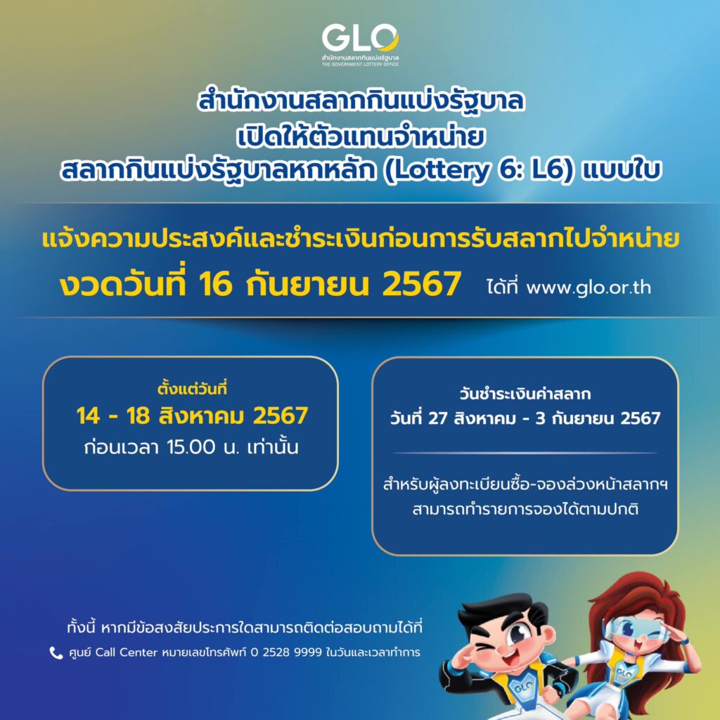 สำนักงานสลากกินแบ่งรัฐบาล เปิดให้ตัวแทนจำหน่ายสลากกินแบ่งรัฐบาลหกหลัก (Lottery 6: L6) แบบใบ แจ้งความประสงค์ และชำระเงินก่อนการรับสลากไปจำหน่าย งวดวันที่ 16 กันยายน 2567 ได้ที่ www.glo.or.th ตั้งแต่วันที่ 14 – 18 สิงหาคม 2567 ก่อนเวลา 15.00 น. เท่านั้น วันชำระเงินค่าสลาก วันที่ 28 สิงหาคม – 3 กันยายน 2567 สำหรับผู้ลงทะเบียนซื้อ – จองล่วงหน้าสลากฯ สามารถทำรายการจองได้ตามปกติ