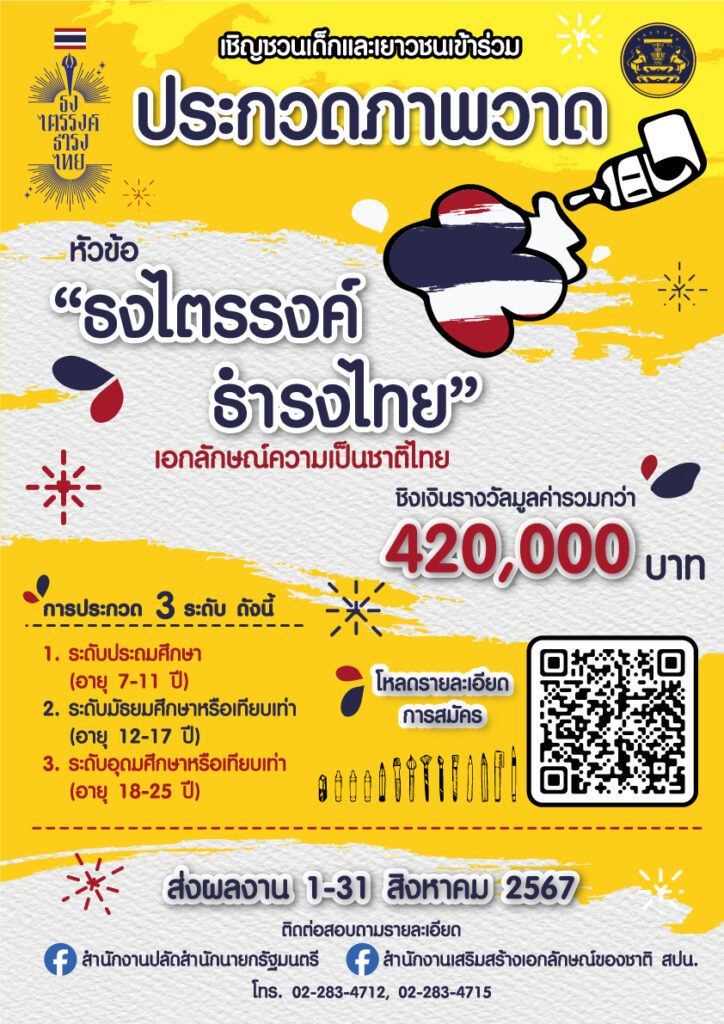 สำนักนายกรัฐมนตรี เชิญชวนเด็กและเยาวชนเข้าร่วมประกวดภาพวาดหัวข้อ “ธงไตรรงค์ ธำรงไทย” เอกลักษณ์ความเป็นชาติไทย โดยส่งผลงาน ตั้งแต่บัดนี้ – 31 สิงหาคม 2567 ชิงเงินรางวัลมูลค่ารวม กว่า 420,000 บาท