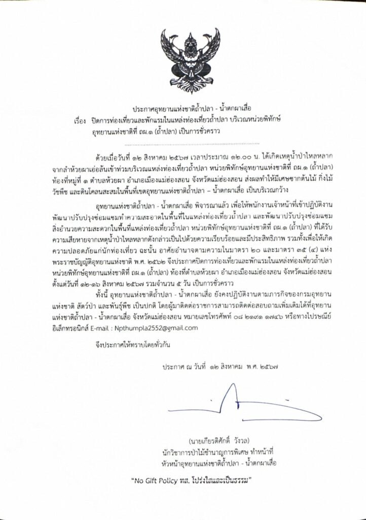 อุทยานแห่งชาติ ถ้ำปลา-น้ำตกผาเสื่อ จังหวัดแม่ฮ่องสอน แจ้งปิดการท่องเที่ยวและพักแรมเป็นการชั่วคราว ตั้งแต่บัดนี้ – 16 สิงหาคม 2567 เนื่องจากเกิดน้ำป่าไหลหลากจากลำห้วยแม่สะงีเข้าท่วมแหล่งท่องเที่ยวถ้ำปลา อุทยานแห่งชาติถ้ำปลา-น้ำตกผาเสื่อ สอบถามเพิ่มเติมที่ โทร. 08 2191 1746 หรือ อีเมล Npthumpla2552@gmail.com