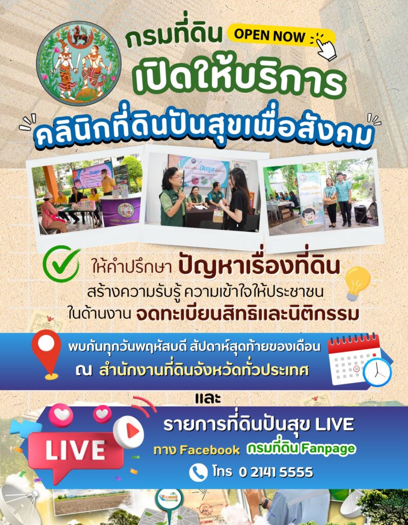 กรมที่ดิน เปิดให้บริการคลินิกที่ดินปันสุข เพื่อสังคม ให้คำปรึกษาเรื่องที่ดิน สร้างการรับรู้ความเข้าใจให้ประชาชน ในด้านงานจดทะเบียนสิทธิและนิติกรรม พบกันทุกวันพฤหัสบดีสัปดาห์สุดท้ายของเดือน ณ สำนักงานที่ดินจังหวัดทั่วประเทศ และ รายการที่ดินปันสุข LIVE ทาง Facebook กรมที่ดิน Fanpage สอบถามเพิ่มเติม โทร. 0 2141 5555