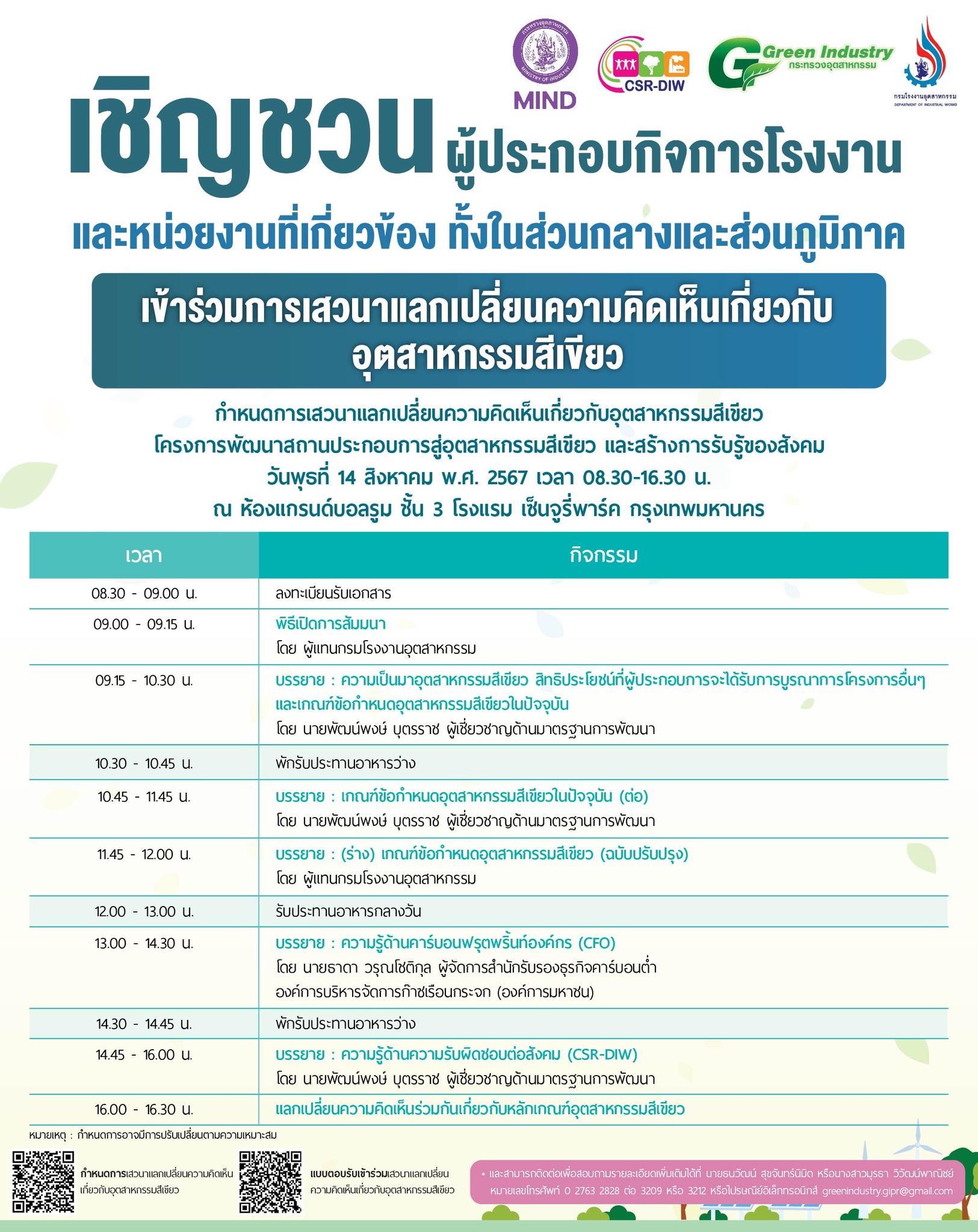 กรมโรงงานอุตสาหกรรม จัดเข้าร่วมการเสวนาแลกเปลี่ยนความคิดเห็นเกี่ยวกับอุตสาหกรรมสีเขียว วันที่ 14 สิงหาคม 2567 เวลา 08.30 – 16.30 น. ณ ห้องแกรนด์บอลรูน ชั้น 3 โรงแรม เซ็นจูรี่พาร์ค กรุงเทพมหานคร