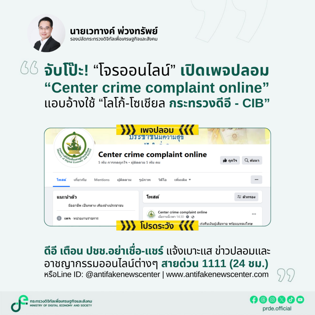 นายเวทางค์ พ่วงทรัพย์ รองปลัดกระทรวงดิจิทัลเพื่อเศรษฐกิจและสังคม (ดีอี) ในฐานะโฆษกกระทรวงฯ เปิดเผยว่า กระทรวง ดีอี โดย ศูนย์ต่อต้านข่าวปลอมประเทศไทย (Anti Fake New Center หรือ AFNC) และเครือข่าย ตรวจสอบการกระทำที่อาจเป็นการก่ออาชญากรรมทางเทคโนโลยี โดยตรวจพบ แฟนเพจ Facebook ปลอม ใช้ชื่อว่า “Center crime complaint online” ซึ่งใช้รูปโปรไฟล์เป็นตราสัญลักษณ์ กระทรวง ดีอี พร้อมทั้งแพลตฟอร์มช่องทางติดต่อของกระทรวงฯ เช่น เบอร์โทรศัพท์ อีเมล์ และ TikTok ฯลฯ