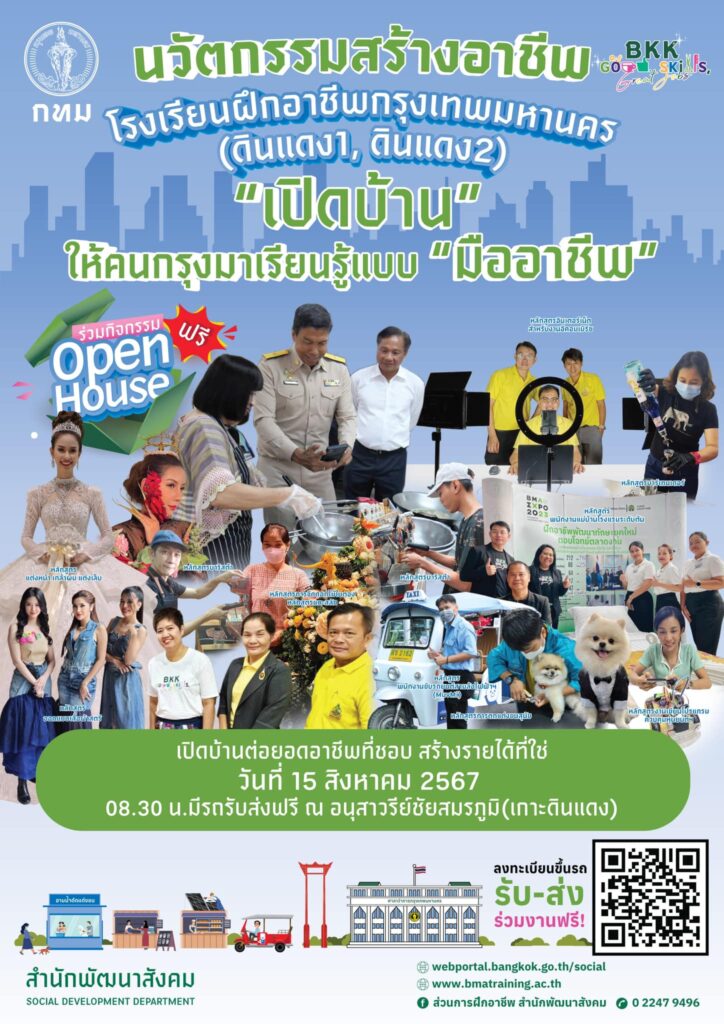 กรุงเทพมหานคร ขอเชิญร่วมกิจกรรม “Open House” เปิดบ้านเรียนรู้ทดลองฝึกอาชีพ ฟรี วันที่ 15 สิงหาคม 2567 ณ โรงเรียนฝึกอาชีพกรุงเทพมหานคร (ดินเดง1 และดินแดง2) มีรถรับส่งฟรี ณ อนุสาวรีย์ชัยสมรภูมิฝั่ง (เกาะดินแดง) เวลา 08.00 – 09.00 น.
