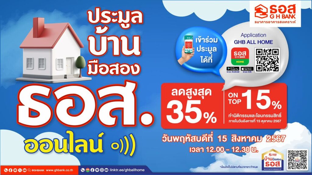 ธนาคารอาคารสงเคราะห์ จัดงาน “ประมูลบ้านมือสองออนไลน์ : GHB’S NPA Online Auction 2024” ประจำเดือนสิงหาคม 2567 ในวันพฤหัสบดีที่ 15 สิงหาคม 2567 พร้อมกันทั่วประเทศ ระหว่างเวลา 12.00-12.30 น. ผ่าน Application : GHB ALL HOME