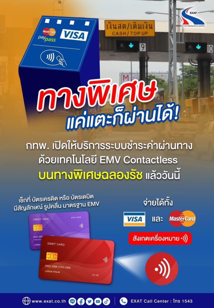 ระบบชำระค่าผ่านทางพิเศษด้วยบัตร EMV Contactless หรือ Europay MasterCard and VISA เป็นระบบการชำระเงินที่ออกแบบมาเพื่อเป็นทางเลือกในการชำระค่าผ่านทาง ให้ประชาชนได้รับความสะดวกสบายโดยมีขั้นตอนง่าย ๆ เพียงแค่ขับรถเข้าช่องชำระค่าผ่านทางด้วยเงินสด ลดกระจก และแตะบัตรที่มีสัญลักษณ์ Contactless ตอบโจทย์วิถีชีวิตยุคใหม่ อีกทั้งยังเป็นรูปแบบการชำระเงินที่เป็นมาตรฐานระดับสากล เพิ่มความสะดวกรวดเร็ว ใช้เวลาน้อยกว่าการชำระค่าผ่านทางด้วยเงินสด ถือเป็นทางเลือกให้กับผู้ใช้บริการทางพิเศษ และลดความแออัดของปริมาณรถสะสมบริเวณหน้าด่านเก็บค่าผ่านทางพิเศษ