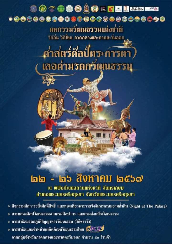 งานมหกรรมวัฒนธรรมแห่งชาติ วิถีถิ่น วิถีไทย ภาคกลางและภาคตะวันออก วันที่ 22 – 26 สิงหาคม 2567 ณ พิพิธภัณฑ์แห่งชาติจันทรเกษม อำเภอพระนครศรีอยุธยา จังหวัดพระนครศรีอยุธยา