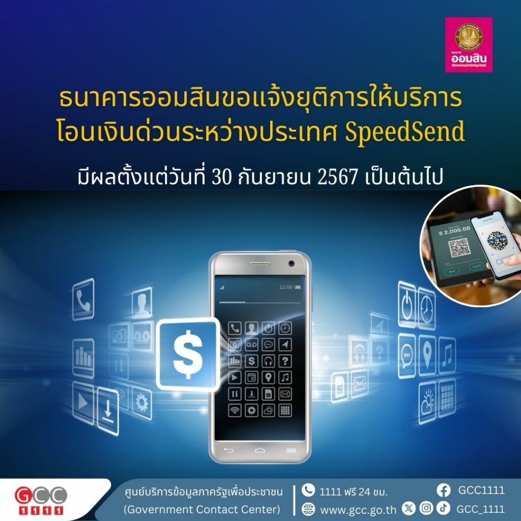 ธนาคารออมสิน ขอแจ้งยุติการให้บริการโอนเงินด่วนระหว่างประเทศ SpeedSend มีผลตั้งแต่วันที่ 30 กันยายน 2567 เป็นต้นไป ทั้งนี้ลูกค้ายังสามารถทำธุรกรรมโอนเงินด่วนระหว่างประเทศผ่านตัวแทนอื่นๆ ของธนาคารได้ตามปกติ (MoneyGram ,Ria Money Transfer) หากมีข้อสงสัย สามารถสอบถามข้อมูลเพิ่มเติมได้ที่ ธนาคารออมสินทุกสาขา หรือ GSB Contact Center 1115