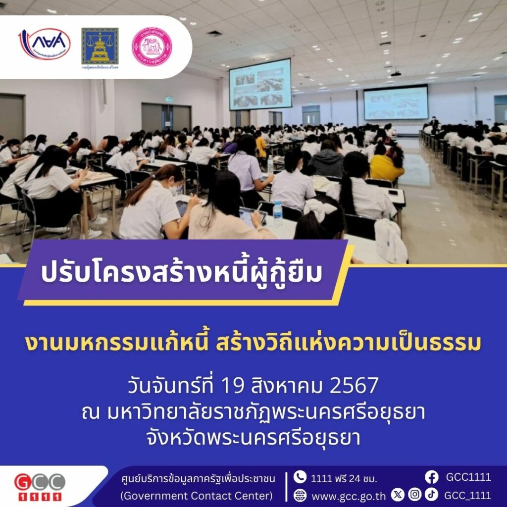 กองทุนเงินให้กู้ยืมเพื่อการศึกษา ลงพื้นที่ร่วมกับ กรมคุ้มครองสิทธิและเสรีภาพ และกรมบังคับคดี ปรับโครงสร้างหนี้ผู้กู้ยืม ในงาน “มหกรรมแก้หนี้ สร้างวิถีแห่งความเป็นธรรม” วันจันทร์ที่ 19 สิงหาคม 2567 ณ มหาวิทยาลัยราชภัฏพระนครศรีอยุธยา จังหวัดพระนครศรีอยุธยา