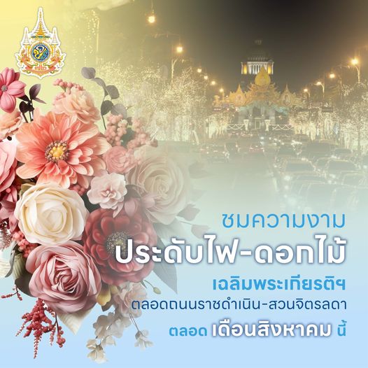 รัฐบาล ขอเชิญชมความงามประดับไฟ – ดอกไม้เฉลิมพระเกียรติพระบาทสมเด็จพระเจ้าอยู่หัว ตลอดถนนราชดำเนิน – สวนจิตรลดา  โดยซุ้มประดับตกแต่งด้วยไฟและดอกไม้นานาพันธุ์ กว่า 2 ล้านต้น บนถนนราชดำเนินกลาง อนุสาวรีย์ประชาธิปไตย หน้าศาลฎีกา ถนนหน้าพระลาน สวนหย่อมหน้าประตูวิเศษไชยศรี สนามหลวง สะพานผ่านฟ้าลีลาศ เชิงสะพานผ่านพิภพลีลา ลานพลับพลามหาเจษฎาบดินทร์ และบริเวณรอบสวนจิตรลดา ตลอดเดือนสิงหาคม 2567 ระหว่างเวลา 18.00 – 24.00 น.