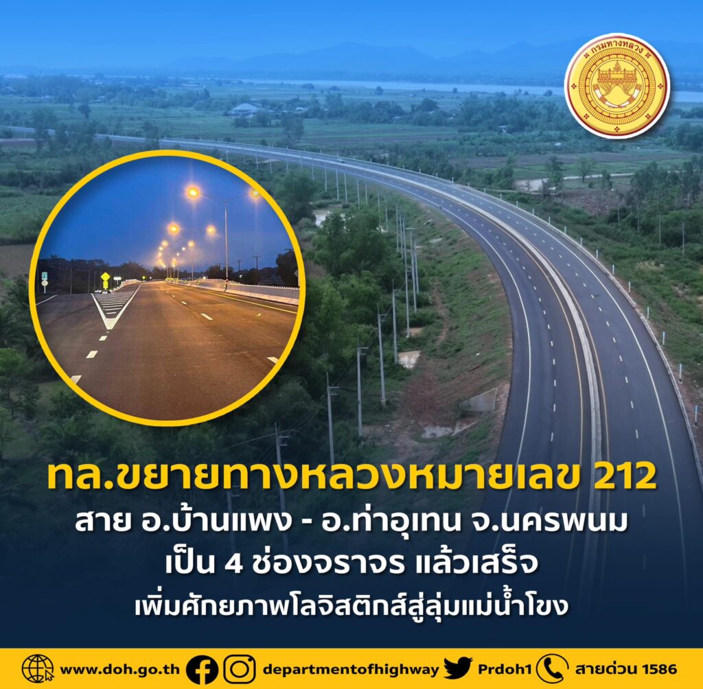 กรมทางหลวง ขยายทางหลวงหมายเลข 212 อ.บ้านแพง – อ.ท่าอุเทน จ.นครพนม เสร็จสมบูรณ์แล้ว