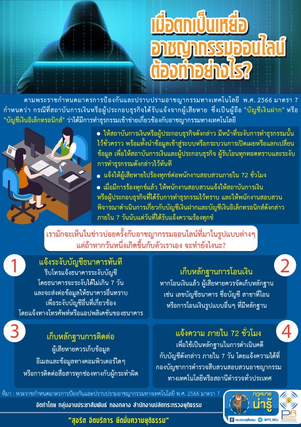 ตามพระราชกำหนดมาตรการป้องกันและปราบปรามอาชญากรรมทางเทคโนโลยี พ.ศ. 2566 มาตรา 7 กำหนดว่า กรณีที่สถาบันการเงินหรือผู้ประกอบธุรกิจได้รับแจ้งจากผู้เสียหาย ซึ่งเป็นผู้ถือบัญชีเงินฝากหรือบัญชีเงินอิเล็กทรอนิกส์ว่าได้มีการทำธุรกรรมเข้าข่ายเกี่ยวข้องกับอาชญากรรมทางเทคโนโลยี