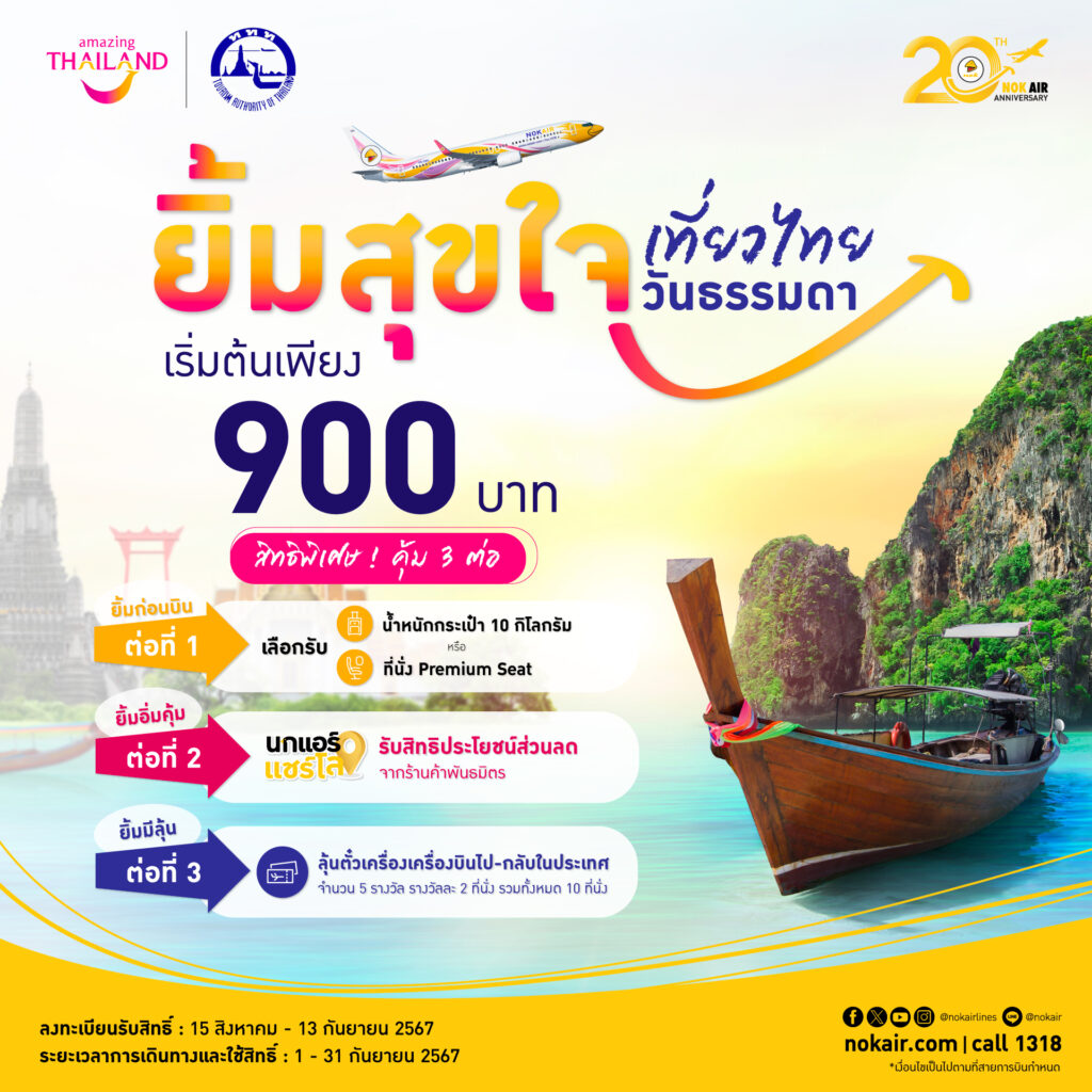 การท่องเที่ยวเเห่งประเทศไทย ร่วมกับ นกแอร์ มอบสิทธิประโยชน์ “ยิ้มสุขใจ เที่ยวไทยในวันธรรมดา” เส้นทางภายในประเทศ ราคาเริ่มต้น 900 บาท พร้อมรับสิทธิพิเศษ 3 ต่อ