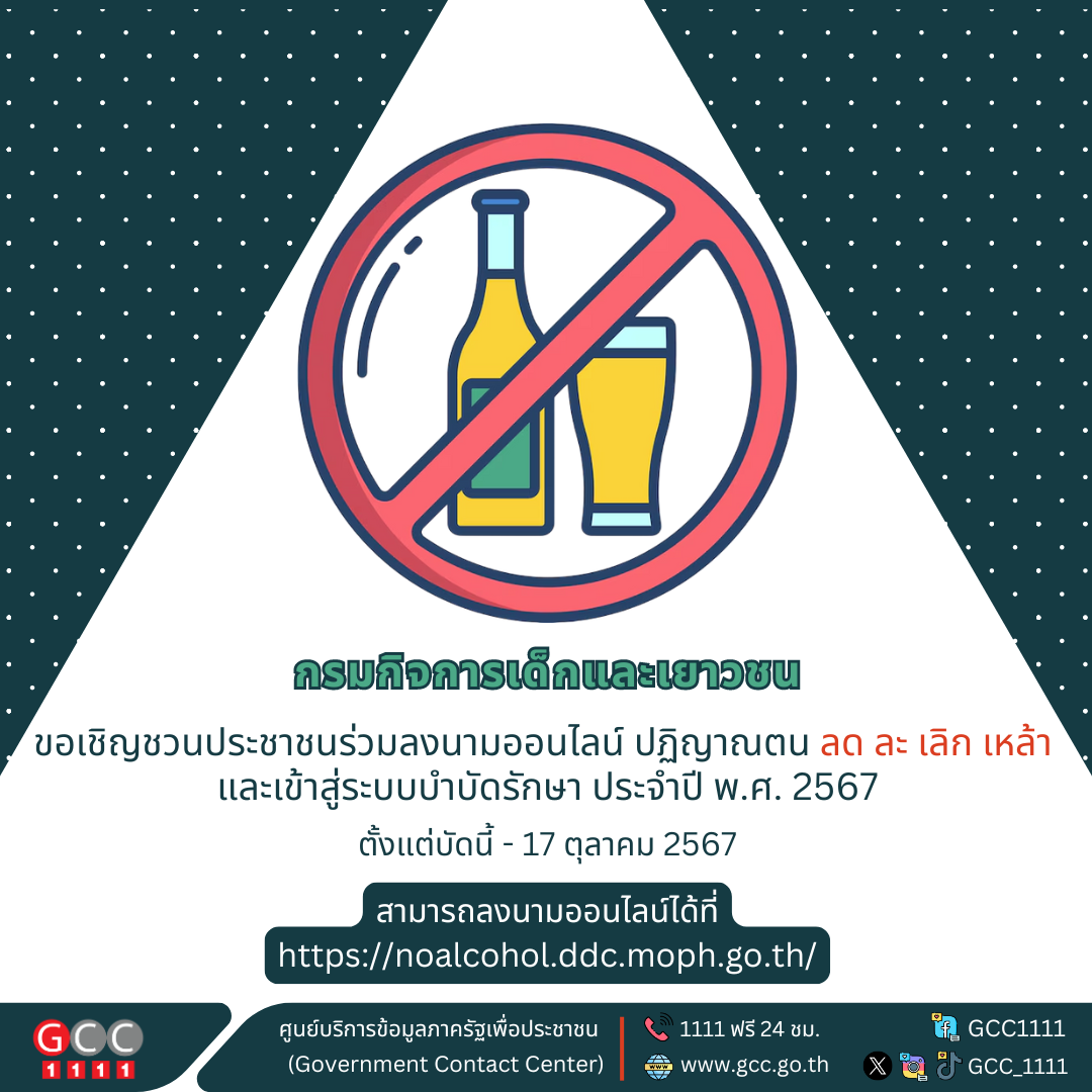 กรมกิจการเด็กและเยาวชน ขอเชิญชวนประชาชนร่วมลงนามออนไลน์ ปฏิญาณตน ลด ละ เลิก เหล้า และเข้าสู่ระบบบำบัดรักษา ประจำปี พ.ศ. 2567 ตั้งแต่บัดนี้ – 17 ตุลาคม 2567