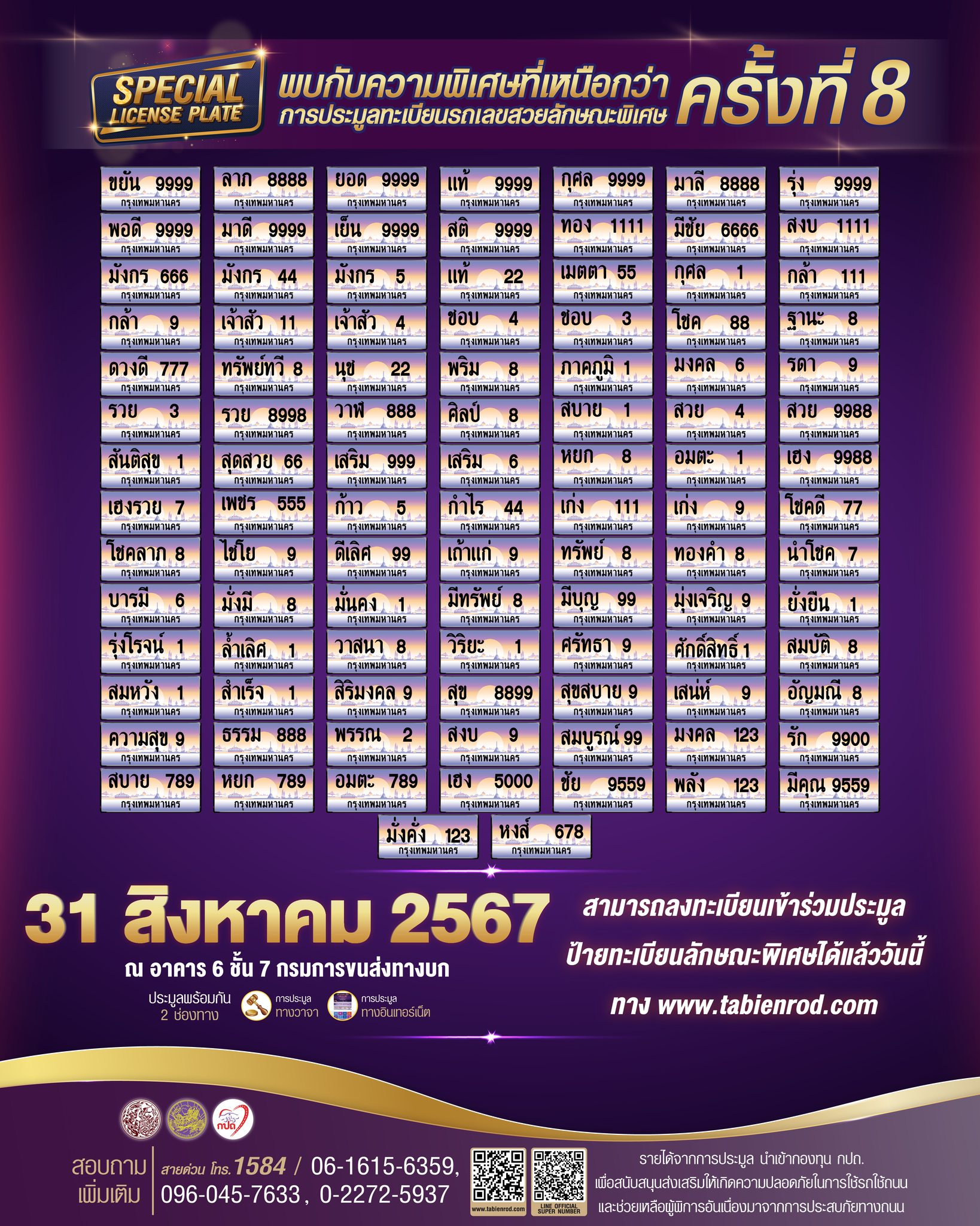 กรมการขนส่งทางบก เปิดให้จองป้ายลักษณะพิเศษ เหนือระดับสำหรับ “คนพิเศษ” ในงานการประมูลเลขสวยลักษณพิเศษครั้งที่ 8 ตั้งแต่บัดนี้ – 31 สิงหาคม 2567 ณ กรมการขนส่งทางบก ประมูลพร้อมกัน 2 ช่องทาง ทางวาจา ทางอินเทอร์เน็ต และ ทางโทรศัพท์ หรือลงทะเบียนและเสนอราคาล่วงหน้าได้ที่ เว็บไซต์ : www.tabienrod.com