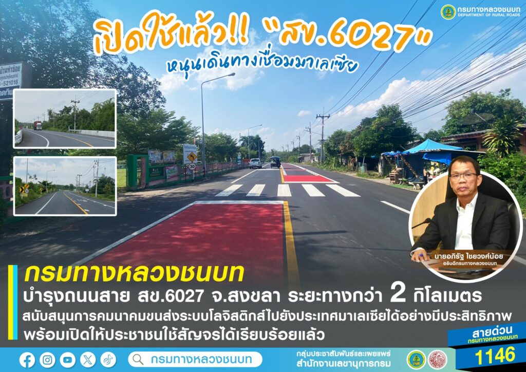 กรมทางหลวงชนบท บำรุงถนนสาย สข.6027 จ.สงขลา ระยะทางกว่า 2 กิโลเมตร สนับสนุนการคมนาคมขนส่งระบบโลจิสติกส์ไปยังประเทศมาเลเซียได้อย่างมีประสิทธิภาพ พร้อมเปิดให้ประชาชนใช้สัญจรได้เรียบร้อยแล้ว