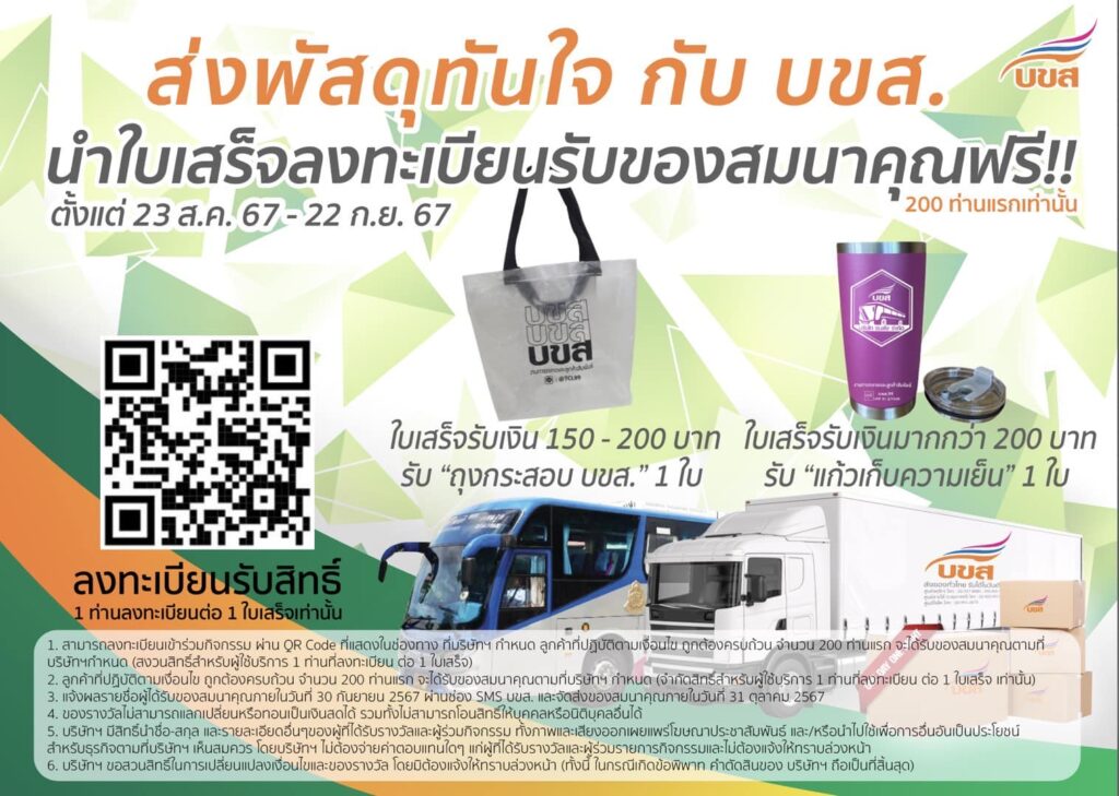 บริษัท ขนส่ง จำกัด จัดกิจกรรม “ส่งพัสดุทันใจกับ บขส. ส่งลงทะเบียนรับของสมนาคุณฟรี”แจกของสมนาคุณฟรี ให้ลูกค้ารับส่งพัสดุภัณฑ์ 200 คนแรก ที่ลงทะเบียนรับสิทธิ์ เริ่มลงทะเบียน ระหว่างวันที่ 23 สิงหาคม – 22 กันยายน 2567 ณ จุดบริการรับส่งพัสดุภัณฑ์ หรือสถานีเดินรถ บขส. ทั่วประเทศ