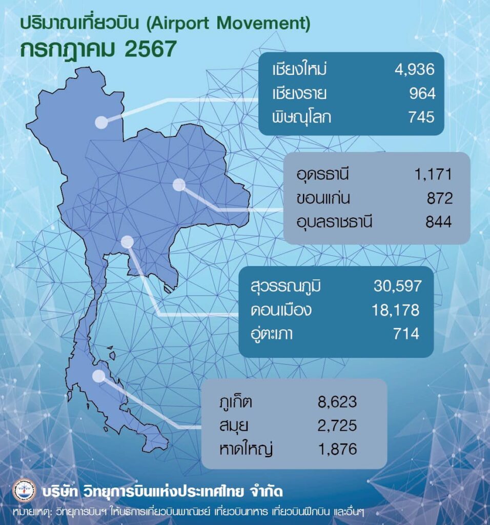 บริษัท วิทยุการบินแห่งประเทศไทย สรุปปริมาณเที่ยวบินที่ให้บริการ เดือนกรกฎาคม 2567