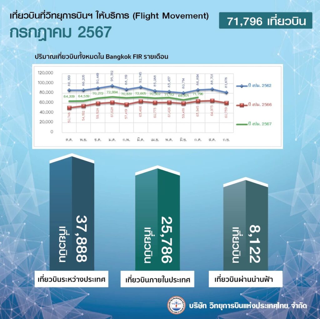บริษัท วิทยุการบินแห่งประเทศไทย สรุปปริมาณเที่ยวบินที่ให้บริการ เดือนกรกฎาคม 2567 รวม 71,796 เที่ยวบิน ได้แก่ ภายในประเทศ 25,786 เที่ยวบิน  ระหว่างประเทศ 37,888 เที่ยวบิน  บินผ่านน่านฟ้า 8,122 เที่ยวบิน ซึ่งเพิ่มขึ้นจากเดือนมิถุนายน 7% หากเปรียบเทียบกับช่วงเวลาเดียวกันของปี 2566 เพิ่มขึ้น 12% และน้อยกว่าปี 2562 ช่วงก่อนโควิด 19%