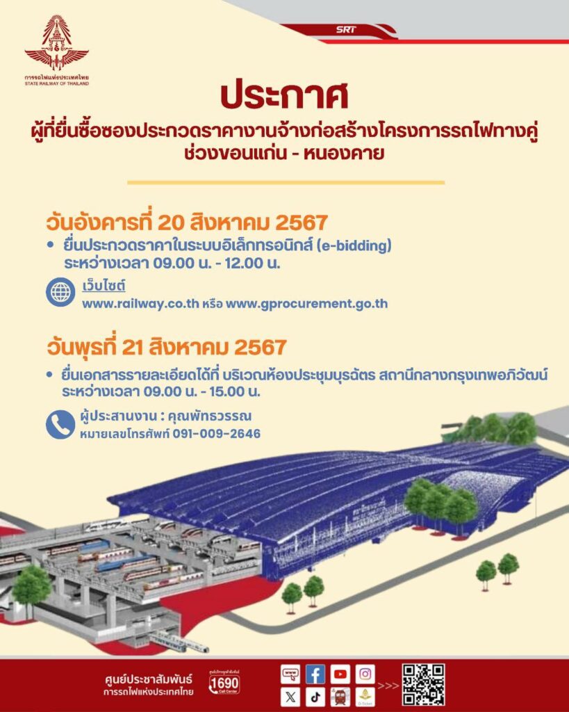 การรถไฟแห่งประเทศไทย แจ้งรายละเอียด การยื่นเอกสารประกวดราคา งานจ้างก่อสร้างโครงการก่อสร้างรถไฟทางคู่ ช่วงขอนแก่น-หนองคาย ตามประกาศ การรถไฟแห่งประเทศไทย ลงวันที่ 21 มิถุนายน 2567