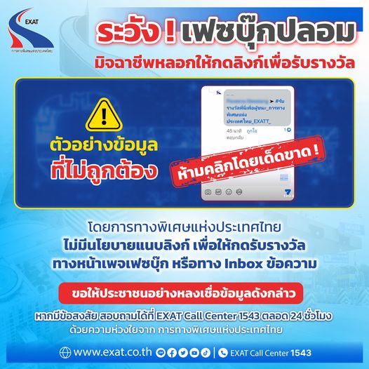 การทางพิเศษแห่งประเทศไทย เตือนระวังเฟซบุ๊กปลอม มิจฉาชีพหลอกให้กดลิงก์เพื่อรับรางวัล