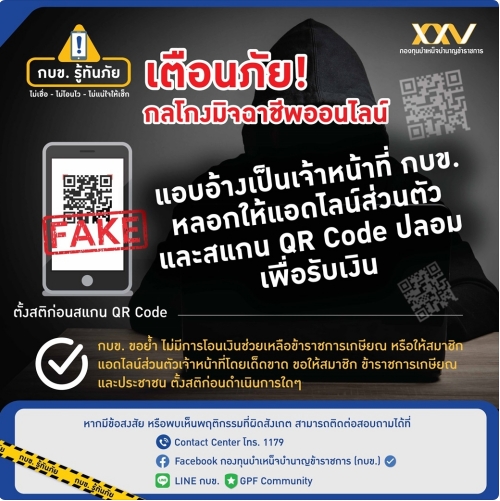 กองทุนบำเหน็จบำนาญข้าราชการ แจ้งเตือนภัยสมาชิก ไม่มีนโยบายโอนเงินช่วยเหลือข้าราชการเกษียณ หรือให้สมาชิกแอดไลน์ส่วนตัวเจ้าหน้าที่และสแกน QR Code ปลอมเพื่อรับเงินโดยเด็ดขาด ขอให้สมาชิก กบข. ข้าราชการเกษียณ และประชาชน โปรดระมัดระวังก่อนดำเนินการใด ๆ และรู้เท่าทันภัย “ไม่เชื่อ ไม่โอนไว ไม่แน่ใจให้เช็ก” หากต้องการแจ้งเบาะแสพฤติกรรมน่าสงสัย สามารถติดต่อ “สายด่วนแจ้งเหตุมิจฉาชีพแอบอ้างเป็น กบข.” โทร. 1179 กด 5