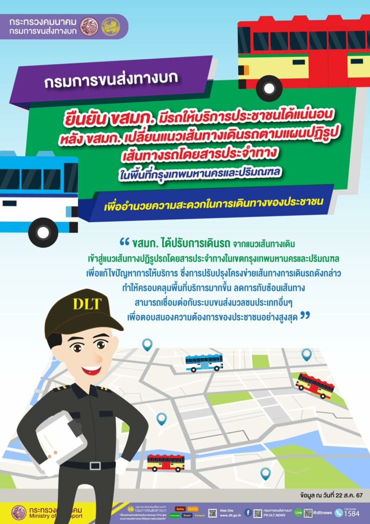 ตามที่มีข่าวในสื่อสังคมออนไลน์เกี่ยวกับ ขสมก. จะหยุดเดินรถตามแผนปฏิรูปเส้นทางรถโดยสารประจำทาง ในพื้นที่กรุงเทพมหานครและปริมณฑล ในวันที่ 31 สิงหาคม 2567 กรมการขนส่งทางบกขอเรียนว่า ขสมก. ได้ปรับการเดินรถจากแนวเส้นทางเดิมเข้าสู่แนวเส้นทางปฏิรูปรถโดยสารประจำทางในเขตกรุงเทพมหานครและปริมณฑล เพื่อแก้ไขปัญหาการให้บริการ ซึ่งการปรับปรุงโครงข่ายเส้นทางการเดินรถดังกล่าว ทำให้ครอบคลุมพื้นที่บริการมากขึ้น ลดการทับซ้อนเส้นทาง สามารถเชื่อมต่อกับระบบขนส่งมวลชนประเภทอื่นๆ เพื่อตอบสนองความต้องการของประชาชนอย่างสูงสุด สำหรับเส้นทางที่มีการเปลี่ยนแนวเส้นทางการเดินรถจากแนวเส้นทางเดิม กรมการขนส่งทางบกจะให้ ขสมก. จัดเก็บข้อมูลการเดินทางของประชาชนเพื่อพิจารณาปรับปรุงเส้นทางให้เหมาะสมกับความต้องการเดินทางของประชาชนต่อไป