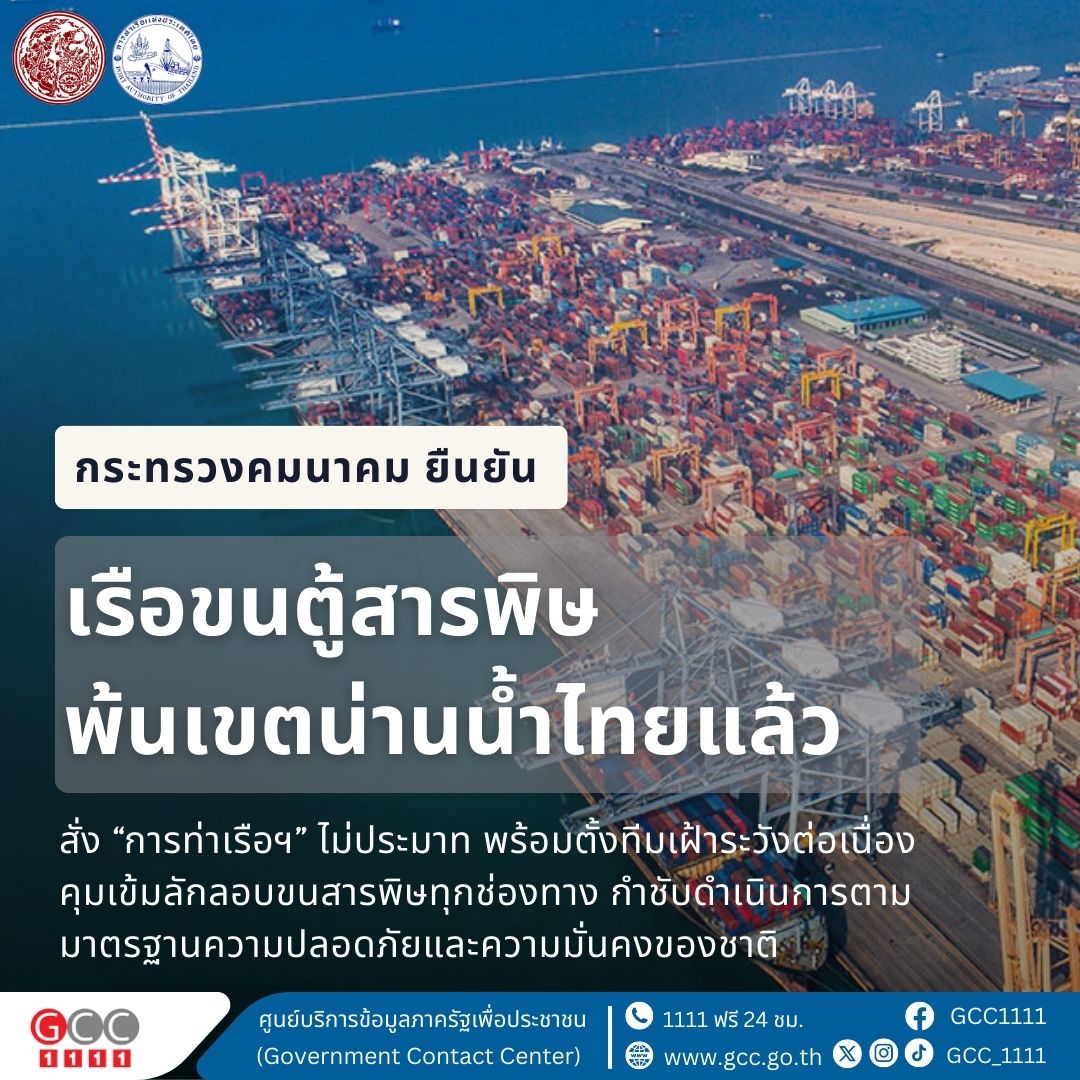 กระทรวงคมนาคม ยืนยัน ”เรือขนตู้สารพิษ“ พ้นเขตน่านน้ำไทยแล้ว สั่งการท่าเรือแห่งประเทศไทยไม่ประมาท พร้อมตั้งทีมเฝ้าระวังต่อเนื่อง เพื่อป้องกันการลักลอบการนำสารพิษเข้ามายังประเทศไทยในทุกช่องทาง พร้อมกำชับให้การท่าเรือแห่งประเทศไทยดำเนินการตามมาตรฐานความปลอดภัย และความมั่นคงของประเทศชาติ
