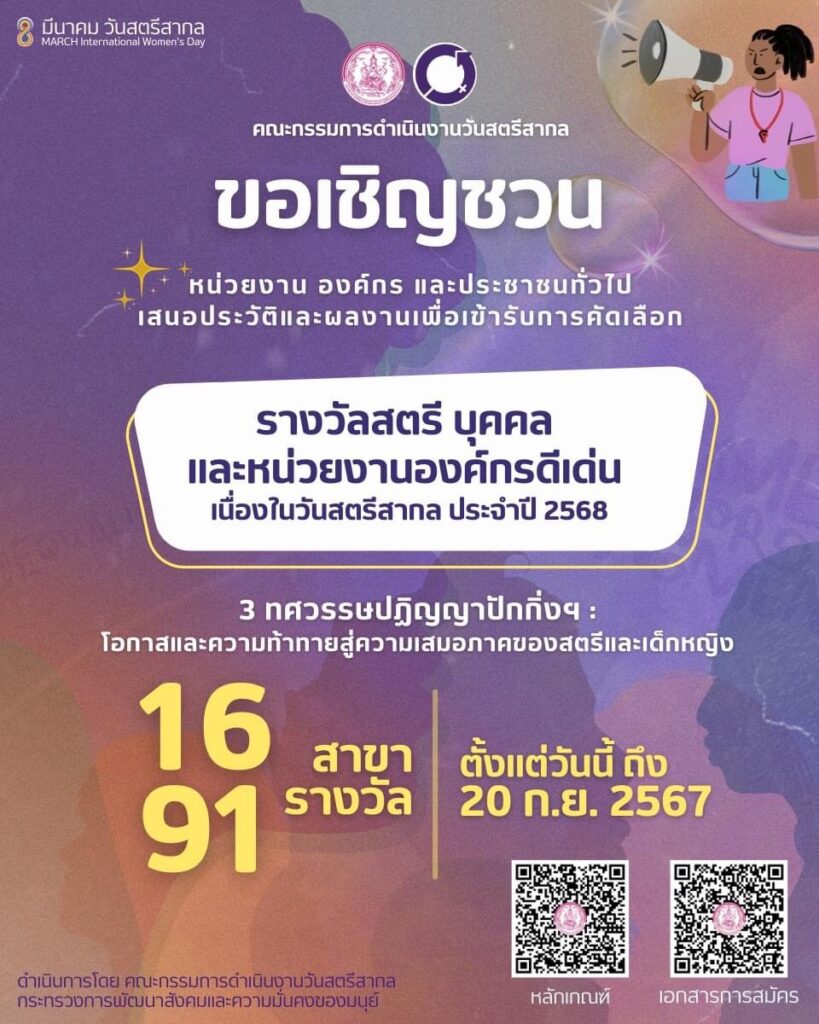กระทรวงพัฒนาสังคมและความมั่นคงของมนุษย์ ขอเชิญหน่วยงาน องค์กร และประชาชนทั่วไป ร่วมเสนอประวัติและผลงานเพื่อเข้ารับการคัดเลือก รางวัลสตรี บุคคล และหน่วยงานองค์กรดีเด่น เนื่องในวันสตรีสากล ประจำปี 2568 จำนวน 16 สาขา 91 รางวัล เพื่อส่งเสริม สนับสนุน และยกย่องเชิดชูเกียรติ แก่สตรี บุคคล หน่วยงานองค์กรที่มีผลงานเด่นสาขาต่างๆ ภายใต้แนวคิด “3 ทศวรรษปฏิญญาปักกิ่งฯ : โอกาสและความท้าทายสู่ความเสมอภาคของสตรีและเด็กหญิง” ส่งผลงานได้ตั้งแต่บัดนี้ – 20 กันยายน 2567