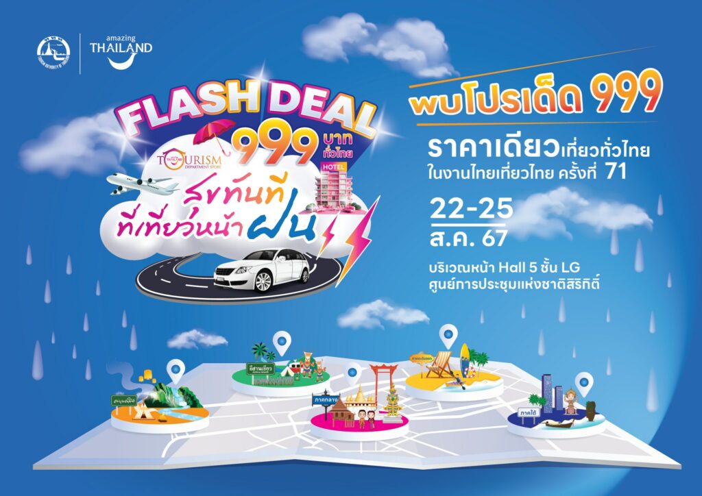 การท่องเที่ยวแห่งประเทศไทย ร่วมโครงการ “ททท. 999 ไทยเที่ยวไทย Tourism Department Store” ภายใต้ “Flash Deal สุขทันทีที่เที่ยวหน้าฝน”  ในงาน “ไทยเที่ยวไทย ครั้งที่ 71” โดยนำเสนอขายสินค้าและบริการด้านการท่องเที่ยวไทย ในราคา 999 บาท จำนวน 20,000 สิทธิ์ วันที่ 22 – 25 สิงหาคม 2567 ตั้งแต่เวลา 10.00-21.00 น. ณ ศูนย์การประชุมแห่งชาติสิริกิติ์ กรุงเทพฯ