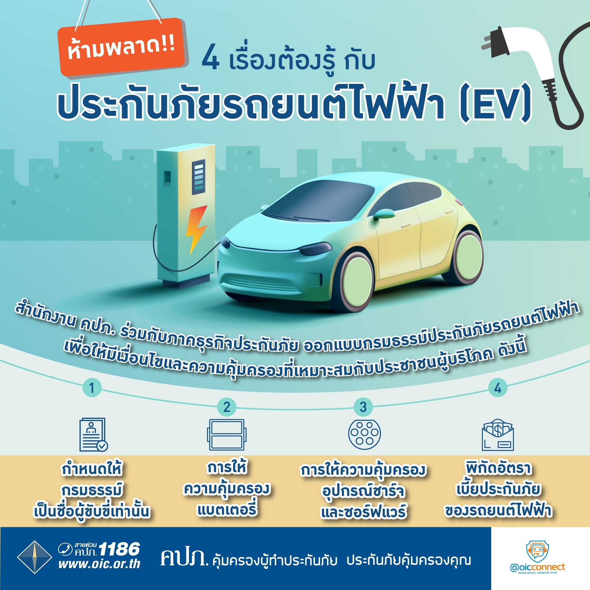 เมื่อหันมาใช้พลังงานสะอาด อย่างรถยนต์ไฟฟ้า (EV) ต้องศึกษา 4 เรื่องต้องรู้ กับ ประกันภัยรถยนต์ไฟฟ้า (EV) สำนักงาน คปภ. ร่วมกับภาคธุรกิจประกันภัย ออกแบบประกันภัยรถยนต์ไฟฟ้าเพื่อให้มีเงื่อนไขและความคุ้มครองที่เหมาะสมกับประชาชนผู้บริโภค ดังนี้