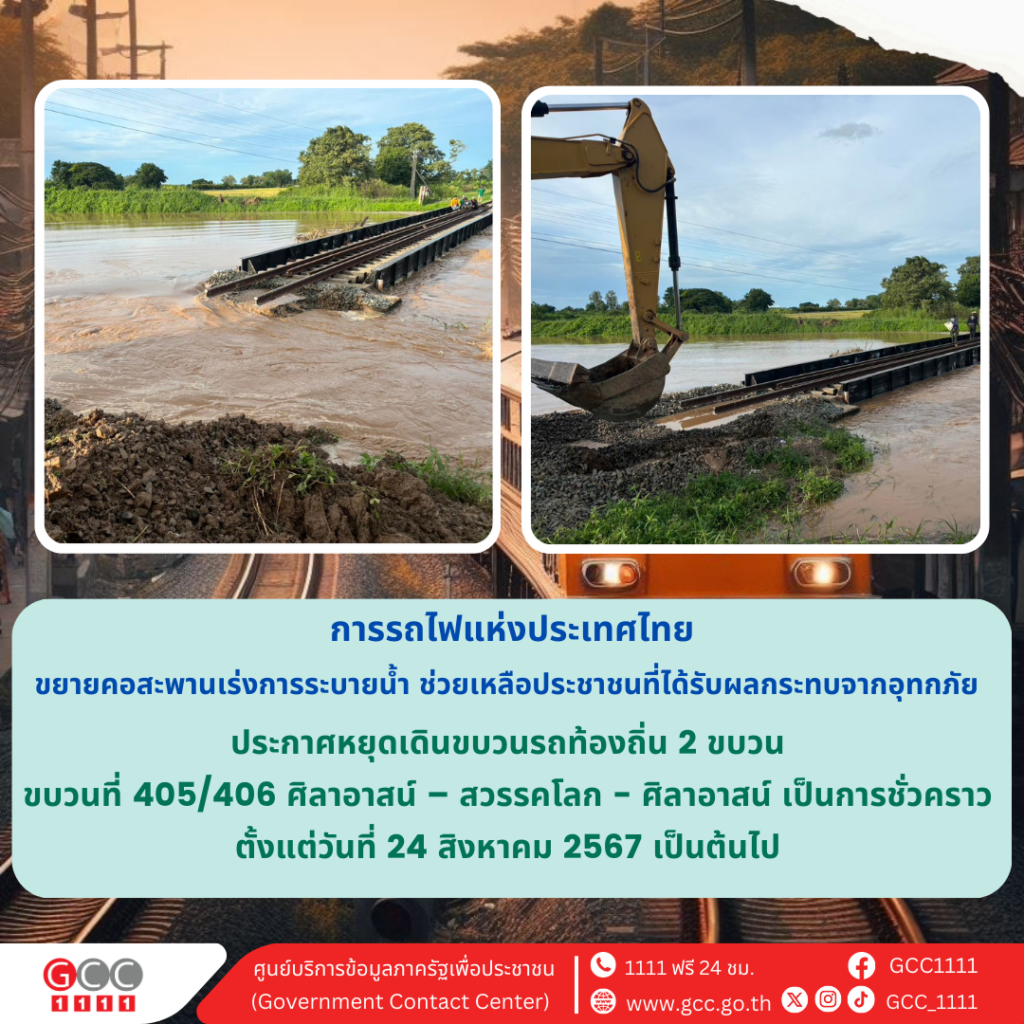 การรถไฟแห่งประเทศไทย ขยายคอสะพานเร่งการระบายน้ำ ช่วยเหลือประชาชนที่ได้รับผลกระทบจากอุทกภัย พร้อมประกาศหยุดเดินขบวนรถท้องถิ่น 405/406 ศิลาอาสน์ – สวรรคโลก – ศิลาอาสน์ เป็นการชั่วคราว ตั้งแต่วันที่ 24 สิงหาคม 2567 เป็นต้นไป ทั้งนี้ ขบวนรถในเส้นทางสายเหนือทุกขบวน ยังคงสามารถเปิดให้บริการได้ตามปกติ
