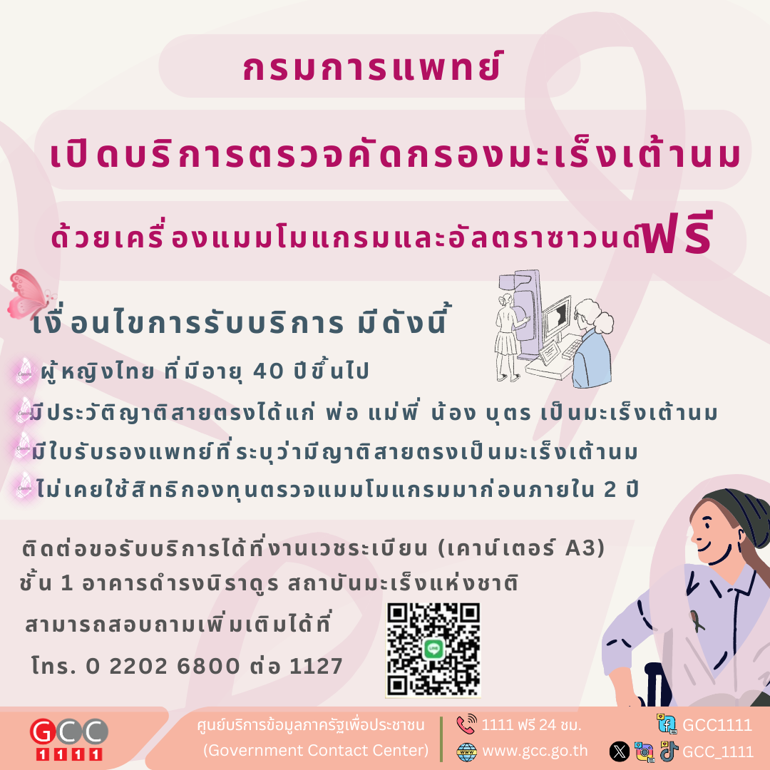 กรมการแพทย์ เปิดบริการตรวจคัดกรองมะเร็งเต้านม ด้วยเครื่องแมมโมแกรมและอัลตราซาวนด์ ฟรี