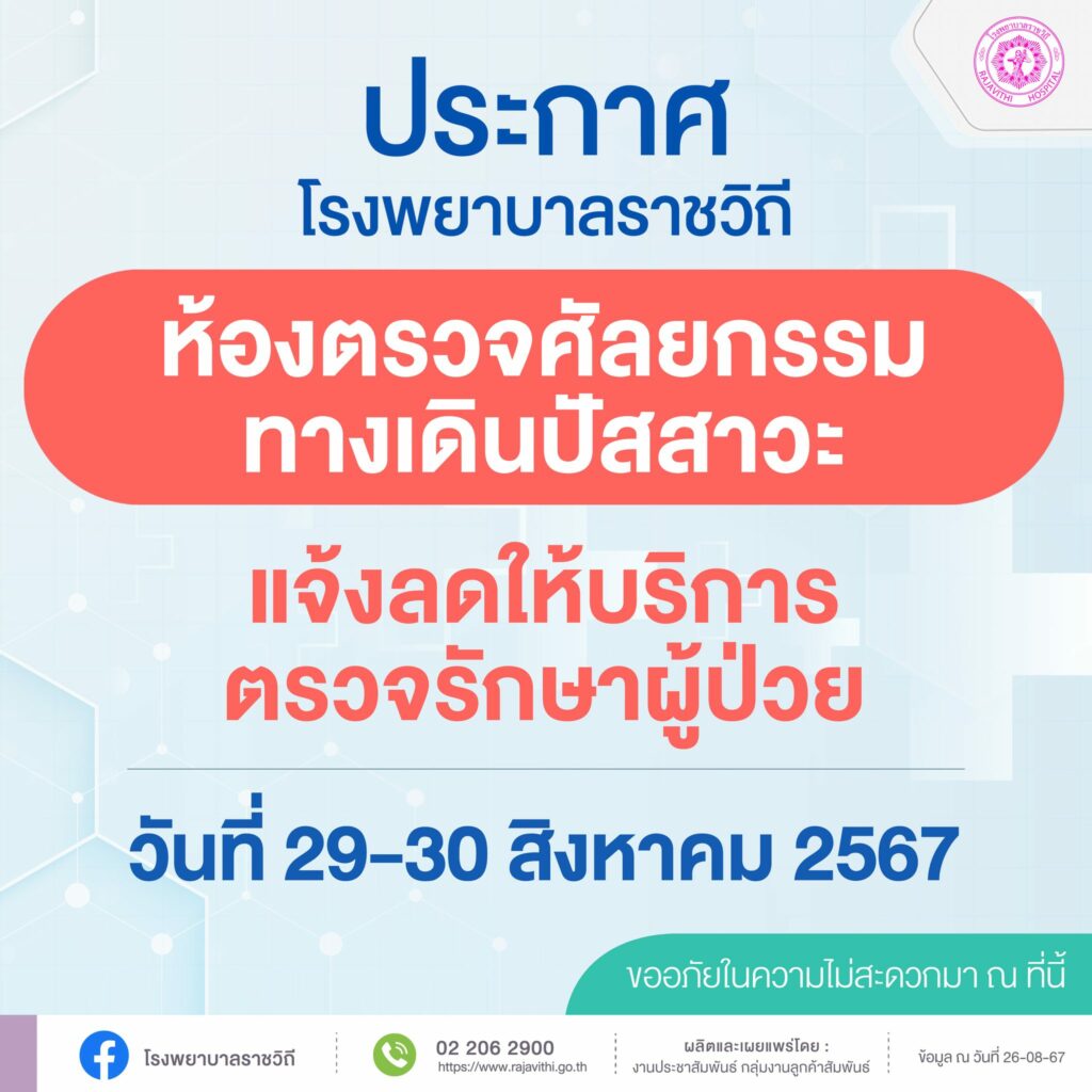 โรงพยาบาลราชวิถี แจ้ง “ห้องตรวจศัลยกรรมทางเดินปัสสาวะ” ลดให้บริการตรวจรักษาผู้ป่วย ข่าวสารกิจกรรม โรงพยาบาลราชวิถี แจ้ง “ห้องตรวจศัลยกรรมทางเดินปัสสาวะ” ลดให้บริการตรวจรักษาผู้ป่วย โรงพยาบาลราชวิถี แจ้ง “ห้องตรวจศัลยกรรมทางเดินปัสสาวะ” ลดให้บริการตรวจรักษาผู้ป่วย วันที่ 29 – 30 สิงหาคม 2567 จึงขออภัยในความไม่สะดวกมา ณ ที่นี้ ที่มา : https://citly.me/zsYfJ Post Views: 7 FacebookFacebookXTwitterLINELine
