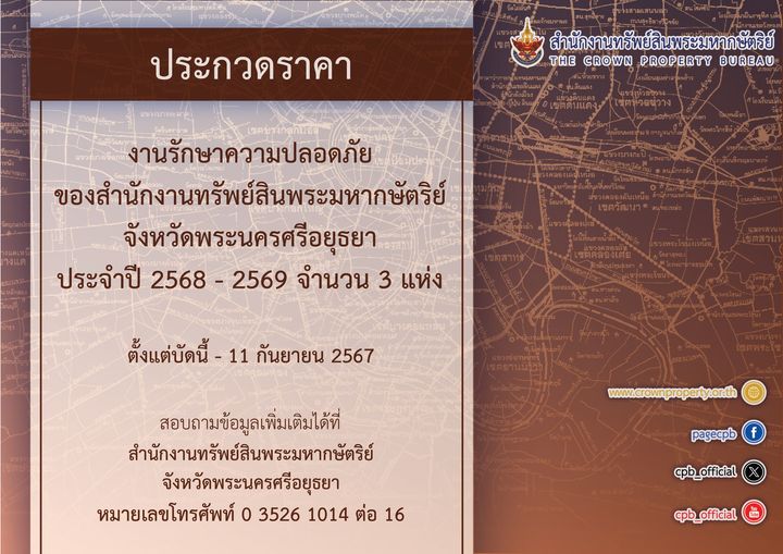 ประกวดราคา : สำนักงานทรัพย์สินพระมหากษัตริย์ เปิดประกวดราคางานรักษาความปลอดภัยของสำนักงานทรัพย์สินพระมหากษัตริย์ จังหวัดพระนครศรีอยุธยา ประจำปี 2568 – 2569 จำนวน 3 แห่ง ดังนี้