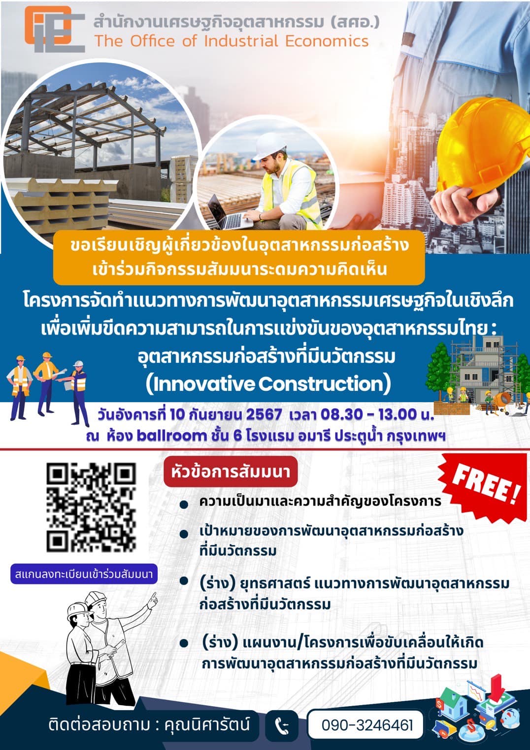สำนักงานเศรษฐกิจอุตสาหกรรม จัดโครงการจัดทำแนวทางการพัฒนาอุตสาหกรรมเศรษฐกิจในเชิงลึก เพื่อเพิ่มขีดความสามารถในการแข่งขันของอุตสาหกรรมไทย อุตสาหกรรมก่อสร้างที่มีนวัตกรรม (Innovation Construction) วันที่ 10 กันยายน 2567 เวลา 08.30 น. – 13.00 น. ณ ห้องบอลรูม ชั้น 6 โรงแรมอมารีประตูน้ำ กรุงเทพฯ ผู้ที่สนใจสามารถลงทะเบียนได้โดยไม่มีค่าใช้จ่ายได้ที่ https://shorturl.asia/SUuo5