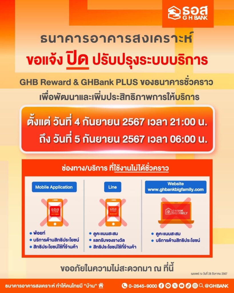 ธอส. ขอแจ้งปิดปรับปรุงระบบบริการ GHB Reward & GHBank PLUS ชั่วคราว